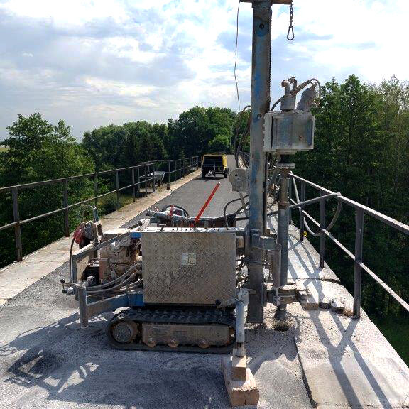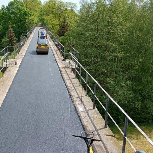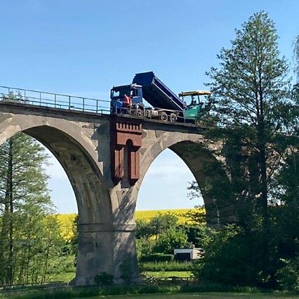Los ging es mit dem Entfernen des Aufwuchses, der sich in den Jahren der Nichtnutzung auf dem Viadukt ausgebreitet hatte. Dann die Entwässerung freilegen, auf Funktionsfähigkeit prüfen und die neuen Regenabllaufrinnen daran anbinden. Danach die Betonfundamente für die Geländerstützen gießen – alle 1,20m eine, soll ja schließlich auch halten. Anschließend noch den Unterbau für die Asphaltdecke aufbringen damit wir endlich schwarz sehen können. 720 m² waren herzustellen. Spektakulär anzusehen und vor allem haben wir dank der „Belastungsprobe“ jetzt die Gewißheit, daß die Brücke das Gewicht der zukünftigen Nutzer tragen wird. Das beruhigt doch ungemein! Als Nächtes rückte die Bohrlafette an und hatte ordentlich zu tun. 370 Bohrungen, jeweils 60 cm tief waren erforderlich. Da glühte der Bohrkopf. Zum Schluß noch das Geländer installieren – insgesamt 460m und das Werk ist vollbracht. Ein schöner Moment.